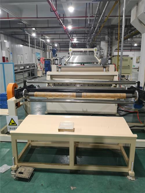 刻度盤指示5、移動(dòng)組件1) 整個(gè)移動(dòng)組件由傳動(dòng)系統(tǒng)、滾輪升降組件等組成,傳動(dòng)電機(jī)功率:0.37kw采用雙級(jí)減速器傳動(dòng),移動(dòng)平穩(wěn),亦可手動(dòng)微調(diào)2)三輥前后移動(dòng)導(dǎo)軌要求長(zhǎng)度為:1500mm;導(dǎo)軌上要有預(yù)留固定孔;方便在客戶現(xiàn)場(chǎng)安裝膨脹螺絲單螺桿片材代加工(六)輥筒控溫裝置(三組/套)模溫機(jī)1) 輥筒的控溫由水溫控制箱來(lái)完成,最高控制油溫90℃2)水泵泵電機(jī)功率:1.5kw;自動(dòng)控水電磁閥;手動(dòng)閥用銅閘閥控制;加大水流量,(七)冷卻牽引切邊裝置1) 牽引電機(jī)功率:1.5kw,壓輥為橡膠輥,主動(dòng)輥為橡膠輥牽引,牽引輥直徑:φ150mm,牽引被動(dòng)輥有效提升距離為:50mm) 托架總長(zhǎng)12米.,平托架,方管結(jié)構(gòu)。過(guò)渡冷卻輥材質(zhì):φ63不銹鋼,輥面寬度1100mm3) 兩側(cè)兩把切刀可有效切除廢料,使片材達(dá)到所需要的寬度,備用4把刀;刀架能上下收縮;安裝刀片的刀桿上帶鍵槽;方便統(tǒng)一調(diào)整刀的角度(八)雙工位收卷機(jī)(二個(gè)輥筒)1)鋁制收卷氣漲軸 :71*1500mm,最大收卷直徑 Φ500mm,最高線速度:V=10米/分。2)飛刀切斷系統(tǒng)一套,放卷平臺(tái)一件