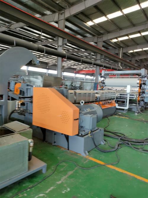 采用優(yōu)質(zhì)鑄鋁加熱器5、水冷卻系統(tǒng)1)水泵泵電機(jī)功率:0.75kw;自動(dòng)控水電磁閥;手動(dòng)閥用銅閘閥控制;加大水流量,2)采用環(huán)保風(fēng)冷卻系統(tǒng)(環(huán)保型:發(fā)明專利號(hào):CN201911312134.6)不需要接外循環(huán)水冷卻,不用徘外水;采用閉環(huán)循環(huán)系統(tǒng) 6、抽真空系統(tǒng):1)真空泵功率:2.2kw;抽真空水箱為不銹鋼材質(zhì);2)采用環(huán)保風(fēng)冷卻系統(tǒng)(環(huán)保型:發(fā)明專利號(hào):CN201911312115.3)不需要接外循環(huán)水冷卻,采用閉環(huán)循環(huán)系統(tǒng)7、液壓板式自動(dòng)換網(wǎng)系統(tǒng):1)位置:固定位置在機(jī)筒出料端和機(jī)頭之間;3)液壓缸、液壓站等一套,采用YA-N46抗磨46#液壓油;(油品需客戶自行采購(gòu))(三)計(jì)量泵1)規(guī)格:JDL-200cc,驅(qū)動(dòng)功率11Kw電機(jī),變頻控制,“三晶或羅賓漢”變頻器,單螺桿片材代加工計(jì)量泵最高轉(zhuǎn)數(shù) 0-60轉(zhuǎn)/分2)計(jì)量泵與減速箱連接,采用萬(wàn)向聯(lián)軸器,泵的入口及出口各配一個(gè)壓力傳感器,(四)片材模具:產(chǎn)品要求:厚度2-3mm,公差±0.20;制品寬度:1500mm1) 出料有效寬度1650mm;制品寬度1500mm;制品厚度1.5-3mm,模頭材料:P20鋼材, 模頭流面鍍硬鉻處理。模具兩邊150mm(五)三輥壓光機(jī)JDL-1700 《一套》L型結(jié)構(gòu)1、機(jī)架:采用型鋼焊接而成,有較高的鋼性。整個(gè)機(jī)架由兩件墻板、頂聯(lián)接板及底座組成,各安裝面均經(jīng)過(guò)機(jī)械加工,以確保安裝精度。2、減速箱、電動(dòng)機(jī):本機(jī)采用輥筒獨(dú)立傳動(dòng),每個(gè)輥筒軸端均配有一傳動(dòng)減速箱,傳動(dòng) 平穩(wěn)、噪音低、效率高,結(jié)構(gòu)緊湊。電動(dòng)機(jī)采用伺服電機(jī),功率:2.2kw×3臺(tái);三輥線速度為0-8米分鐘3、單螺桿片材代加工輥筒組件1) 輥筒直徑:上輥φ400mm /中輥φ400mm/下輥φ400mm,輥面寬度1700mm2) 輥筒,輥筒控溫水進(jìn)出口徑:11/4”輥筒圓度:0.005mm,輥筒同軸度:φ0.012mm輥筒表面粗糙度:Ra0.025μm,輥筒外圓表面淬硬HRC55~60,淬硬深度3~5mm;輥筒表面鍍硬鉻,t=0.08~0.10,輥筒壁厚:30mm4、輥筒調(diào)距裝置1) 輥筒上下采用電動(dòng)渦輪蝸桿升降。微調(diào)為手動(dòng),并兩端可單獨(dú)調(diào)節(jié),調(diào)節(jié)范圍0-70mm,2) 輥筒間隙調(diào)整采用絲桿結(jié)構(gòu),手動(dòng)微調(diào),微調(diào)范圍:1-5mm,